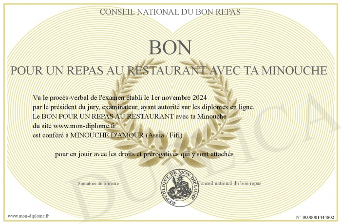 Envoyez par email votre BON POUR UN REPAS AU RESTAURANT avec ta Minouche personalisé
