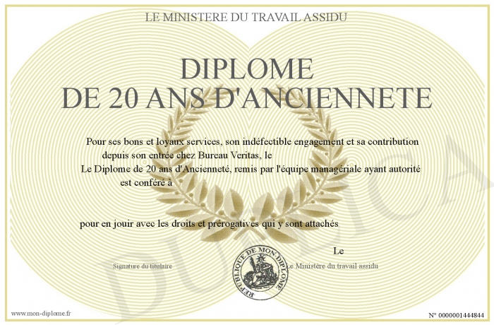 Envoyez par email votre Diplôme de 20 ans d'Ancienneté personalisé