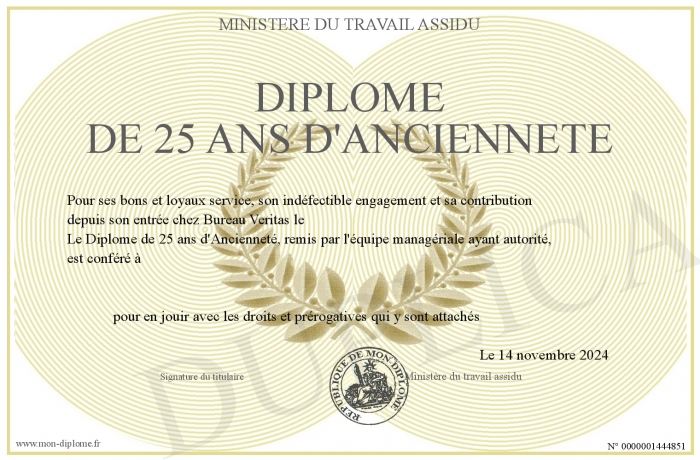 Envoyez par email votre Diplôme de 25 ans d'Ancienneté personalisé