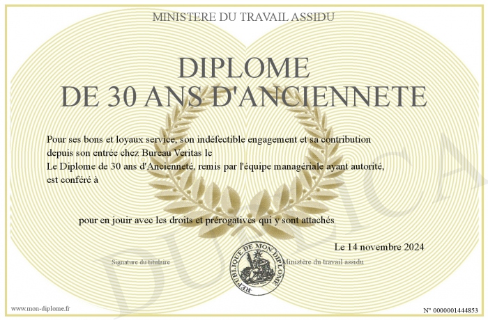 Envoyez par email votre Diplôme de 30 ans d'Ancienneté personalisé