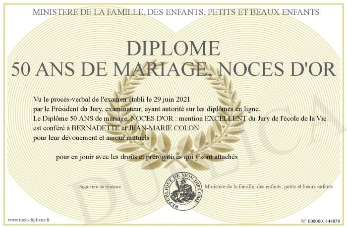 Envoyez par email votre Diplôme 50 ans de mariage, noces d'or personalisé