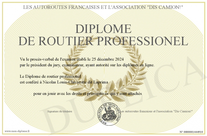 Envoyez par email votre Diplôme de routier professionel personalisé