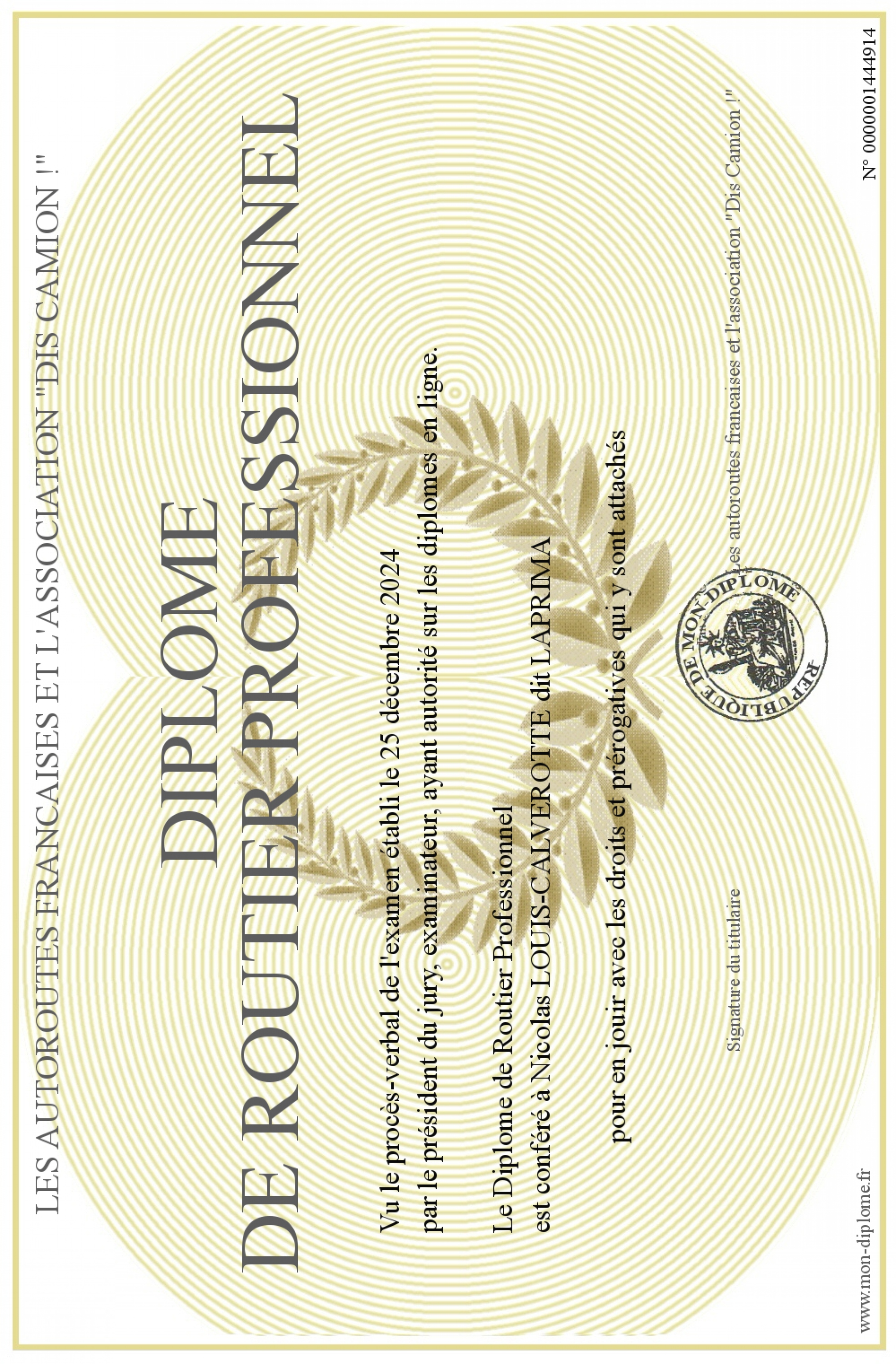 Envoyez par email votre Diplôme de Routier Professionnel personalisé