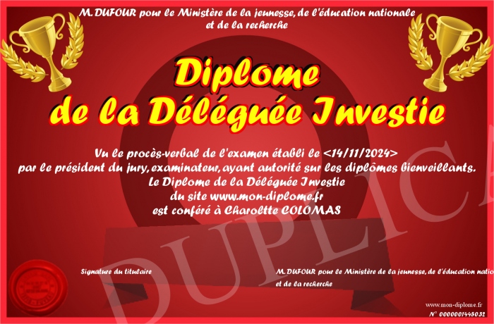 Envoyez par email votre Diplôme de la Déléguée Investie personalisé