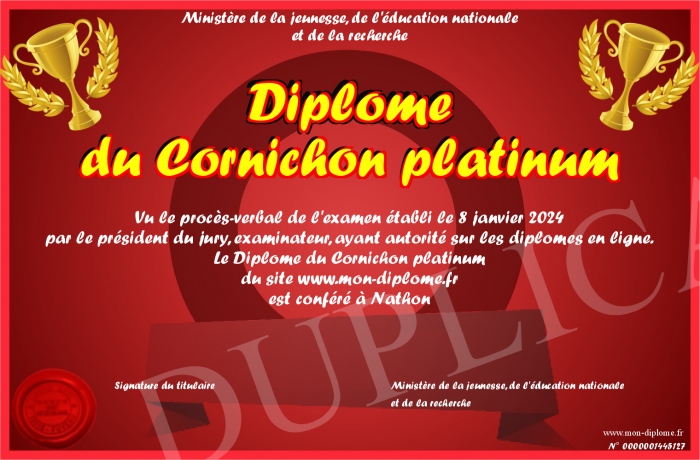 Envoyez par email votre Diplôme du Cornichon platinum personalisé