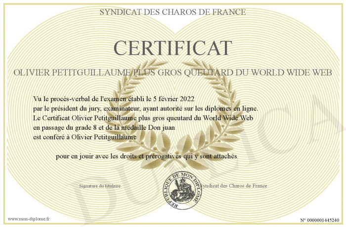 Envoyez par email votre Certificat Olivier Petitguillaume plus gros queutard du World Wide Web personalisé