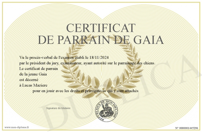 Envoyez par email votre Certificat de parrain de Gaia personalisé