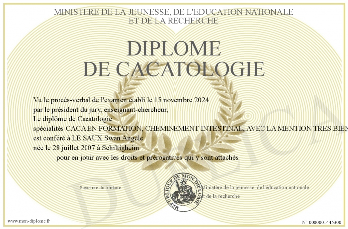 Envoyez par email votre Diplôme de cacatologie personalisé