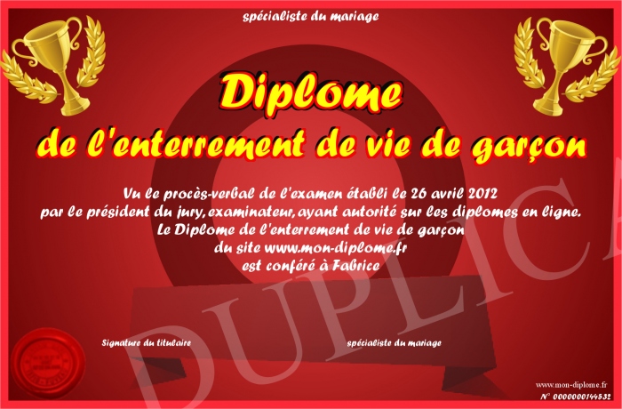 Envoyez par email votre Diplôme de l'enterrement de vie de garçon personalisé