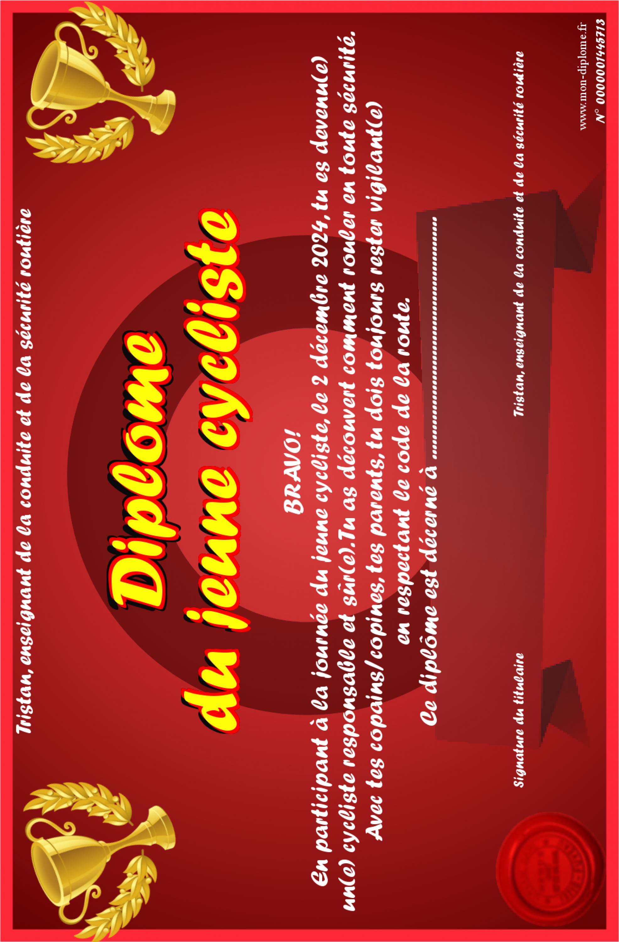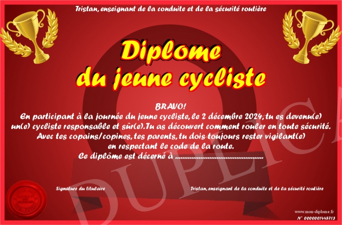 Envoyez par email votre Diplôme du jeune cycliste personalisé