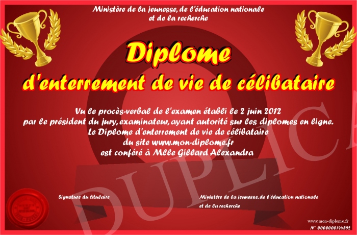 Envoyez par email votre Diplôme d'enterrement de vie de célibataire personalisé