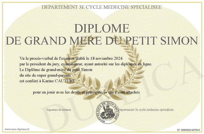 Envoyez par email votre Diplôme de grand mère du petit Simon personalisé