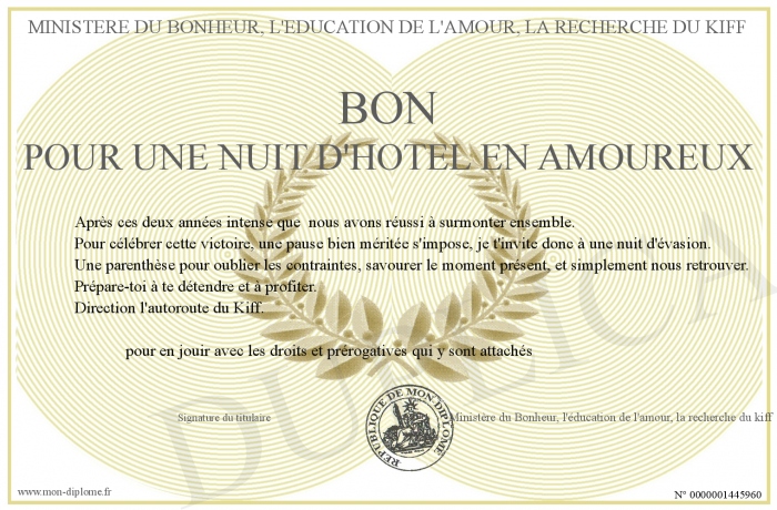Envoyez par email votre BON POUR UNE NUIT D'HOTEL EN AMOUREUX personalisé