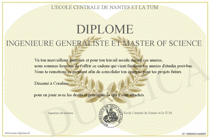 Envoyez par email votre Diplôme Ingénieure Généraliste et Master of Science personalisé