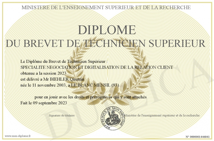 Envoyez par email votre Diplôme du BREVET DE TECHNICIEN SUPERIEUR personalisé