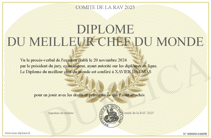 Envoyez par email votre Diplôme du meilleur chef du monde personalisé