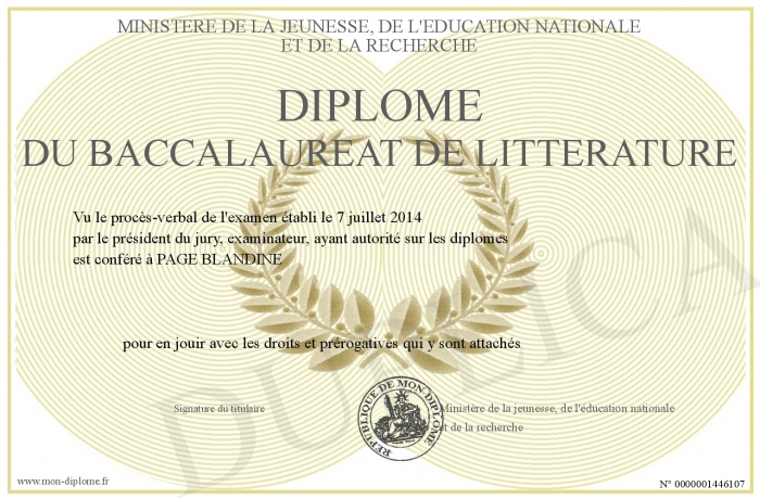Envoyez par email votre Diplôme du baccalaureat de Littérature personalisé