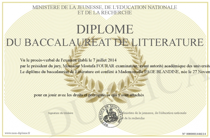• Diplôme du baccalaureat de Littérature