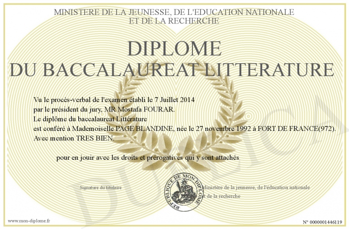 Envoyez par email votre Diplôme du baccalaureat Littérature personalisé