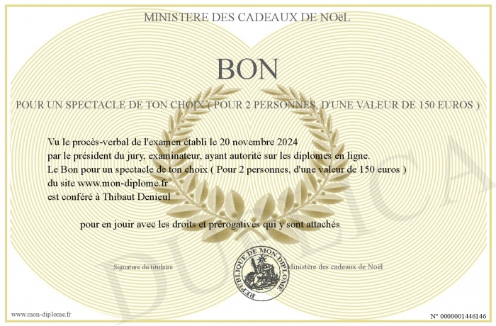 Envoyez par email votre Bon pour un spectacle de ton choix ( Pour 2 personnes, d'une valeur de 150 euros ) personalisé