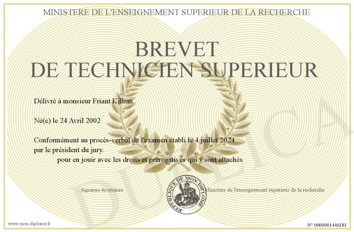 Envoyez par email votre Brevet de Technicien Supérieur personalisé