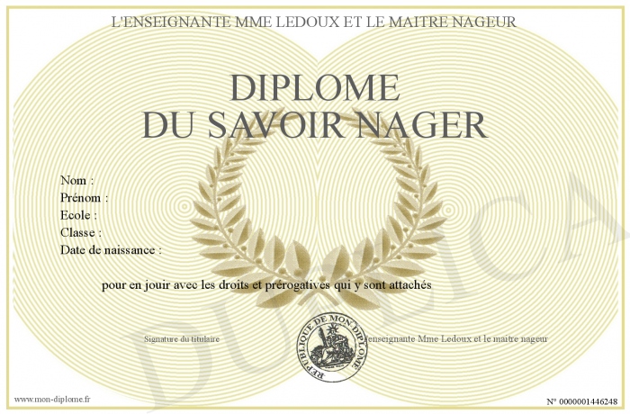 Envoyez par email votre Diplôme du savoir nager personalisé