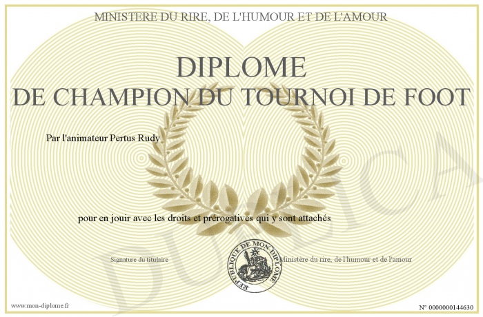 Envoyez par email votre diplome de champion du tournoi de foot personalisé