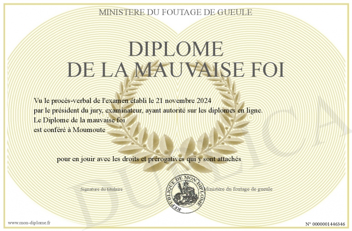 Envoyez par email votre Diplôme de la mauvaise foi personalisé