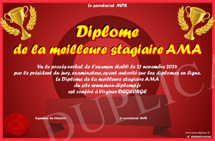 Envoyez par email votre Diplôme de la meilleure stagiaire AMA personalisé