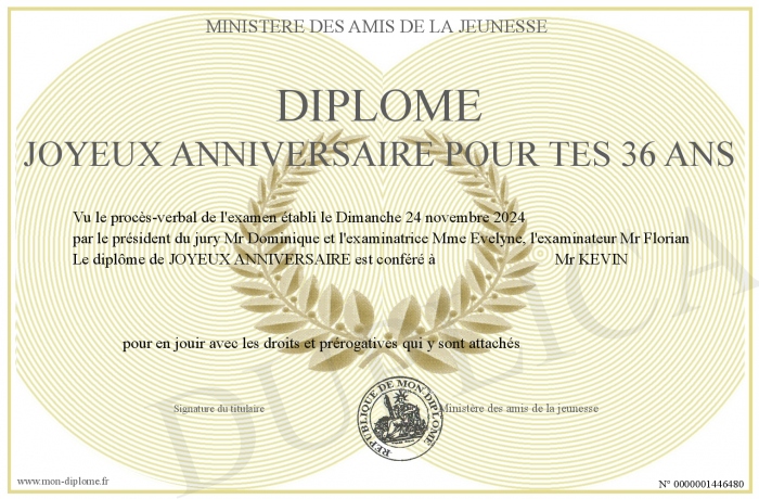 Envoyez par email votre Diplôme JOYEUX ANNIVERSAIRE POUR TES 36 ANS personalisé