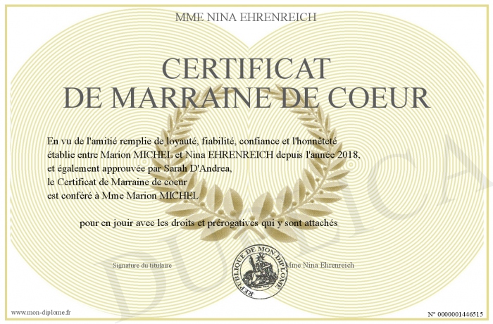 Envoyez par email votre Certificat de Marraine de coeur personalisé