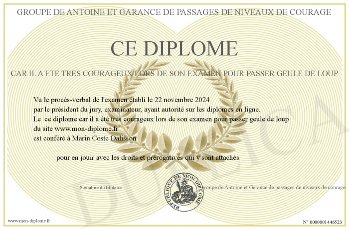Envoyez par email votre ce diplome car il a été très courageux lors de son examen pour passer geule de loup personalisé