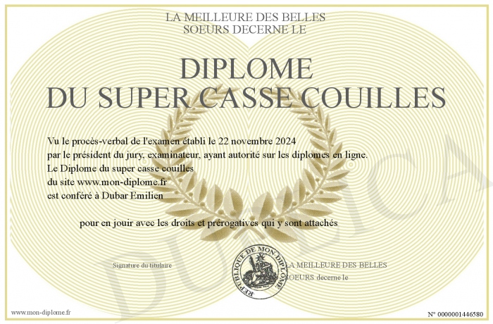Envoyez par email votre Diplôme du super casse couilles personalisé