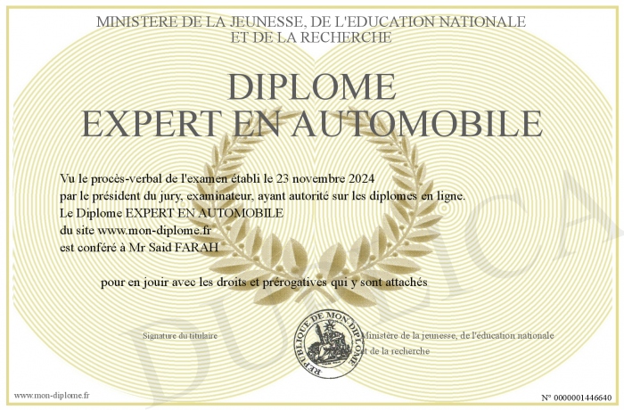 Envoyez par email votre Diplôme EXPERT EN AUTOMOBILE personalisé