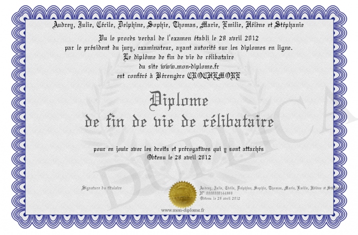 Envoyez par email votre Diplôme de fin de vie de célibataire personalisé