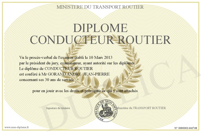 Envoyez par email votre Diplôme CONDUCTEUR ROUTIER personalisé