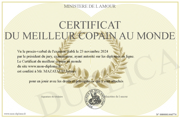 Envoyez par email votre Certificat du meilleur copain au monde personalisé