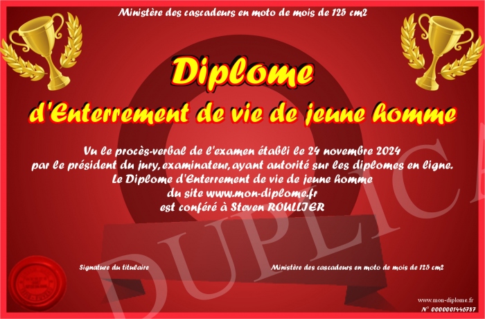 Envoyez par email votre Diplome d'Enterrement de vie de jeune homme personalisé