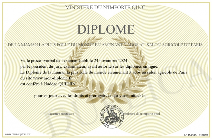 Envoyez par email votre Diplôme de la maman la plus folle du monde en amenant 3 ados au salon agricole de Paris personalisé