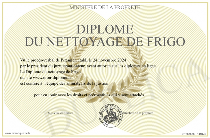 Envoyez par email votre Diplôme du nettoyage de Frigo personalisé
