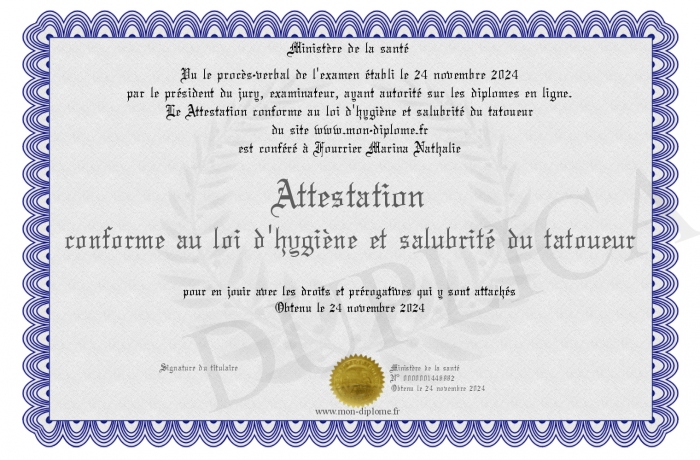 Envoyez par email votre Attestation conforme au loi d'hygiène et salubrité du tatoueur personalisé