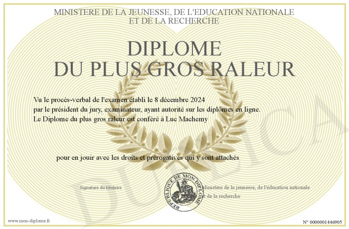 Envoyez par email votre Diplôme du plus gros raleur personalisé