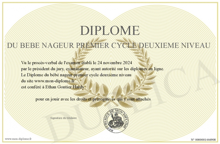 Envoyez par email votre Diplôme du bébé nageur premier cycle deuxième niveau personalisé
