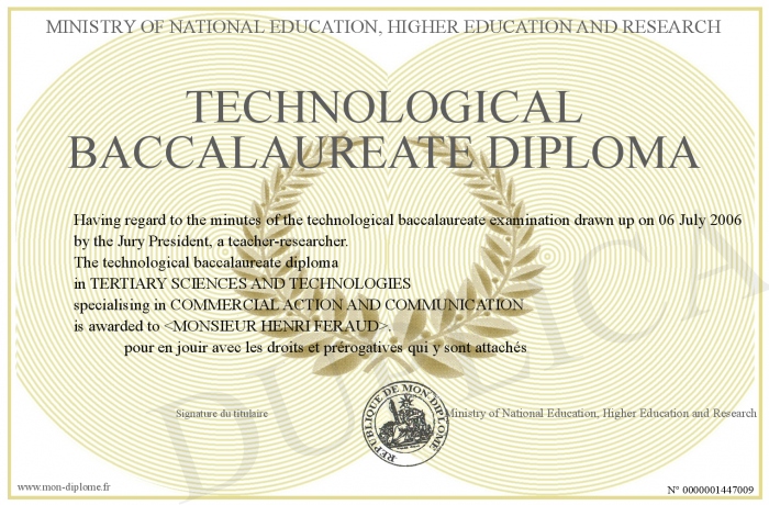 Envoyez par email votre Technological baccalaureate diploma personalisé