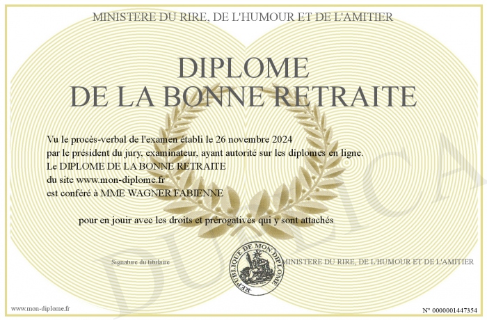 Envoyez par email votre DIPLOME DE LA BONNE RETRAITE personalisé