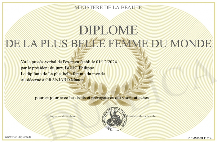 Envoyez par email votre Diplôme de la plus belle femme du monde personalisé