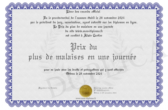 Envoyez par email votre Prix du plus de malaises en une journée personalisé