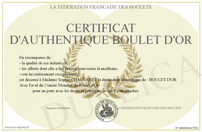 Envoyez par email votre CERTIFICAT D'AUTHENTIQUE BOULET D'OR personalisé
