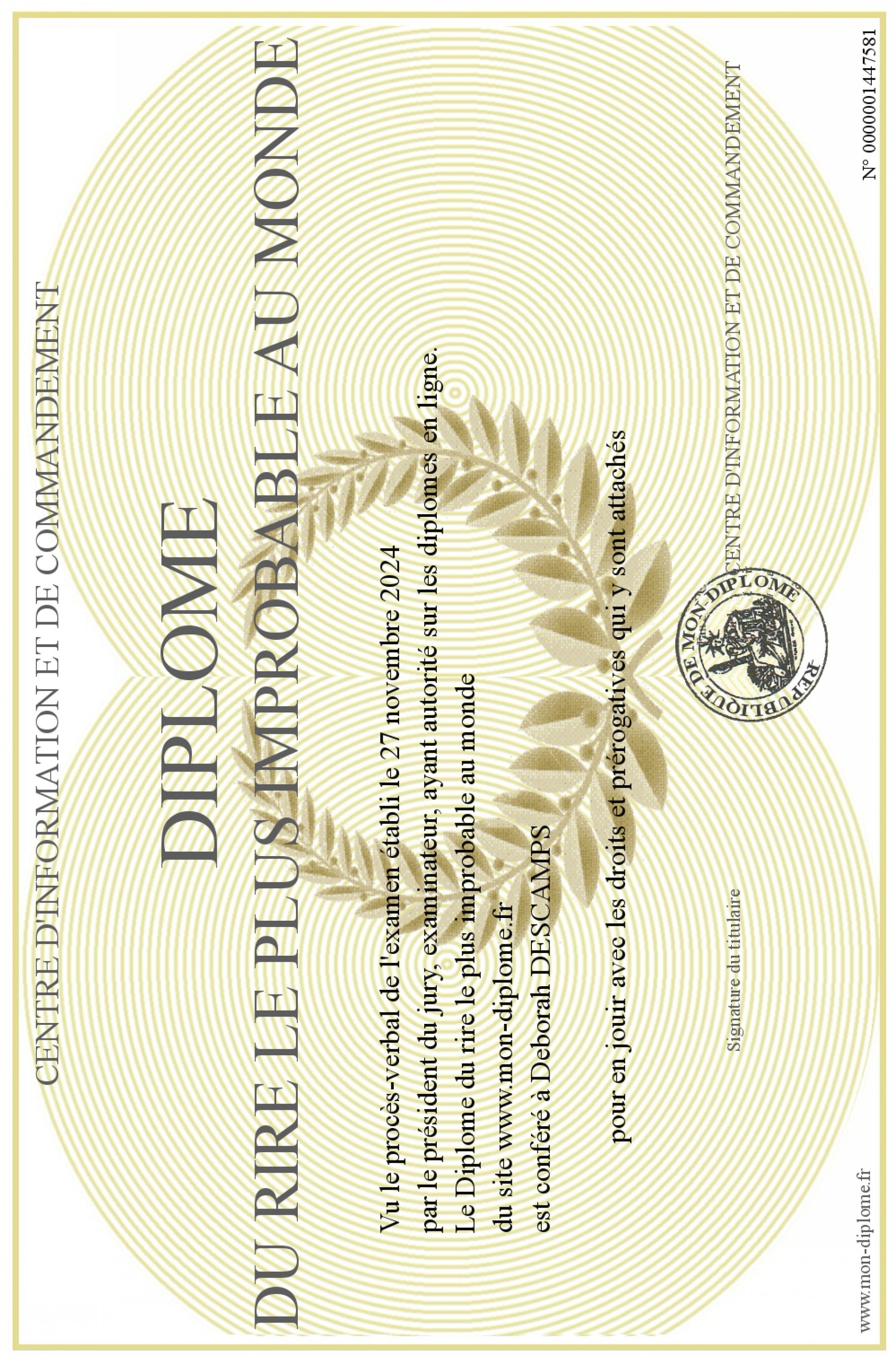 Envoyez par email votre Diplôme du rire le plus improbable au monde personalisé