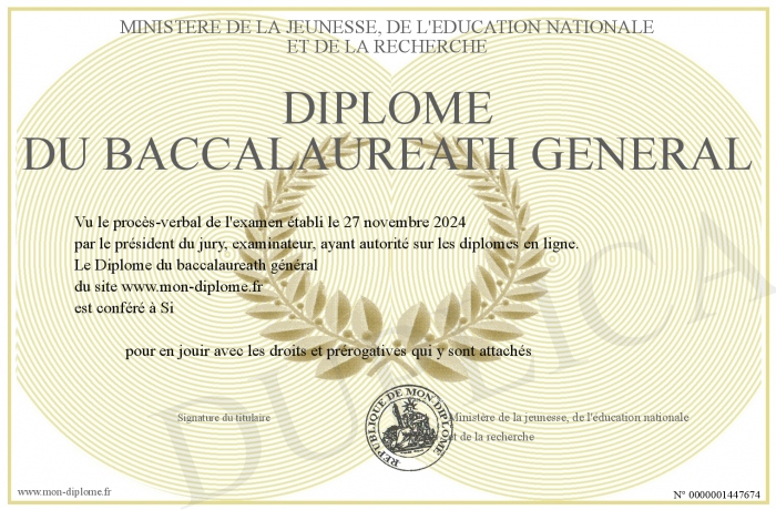 Envoyez par email votre Diplôme du baccalaureath général personalisé